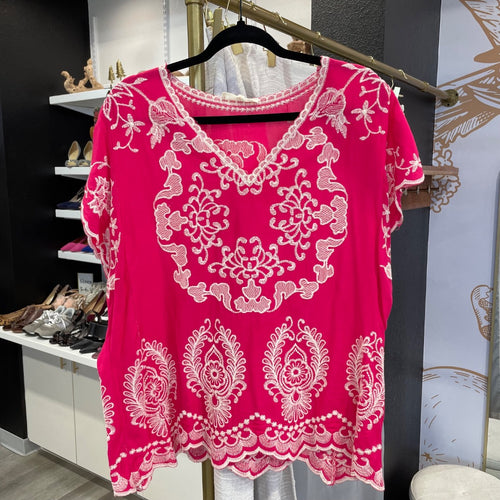 Solitaire | Women's Pink and Cream Embroidered Short Sleeve Top | Size: XL