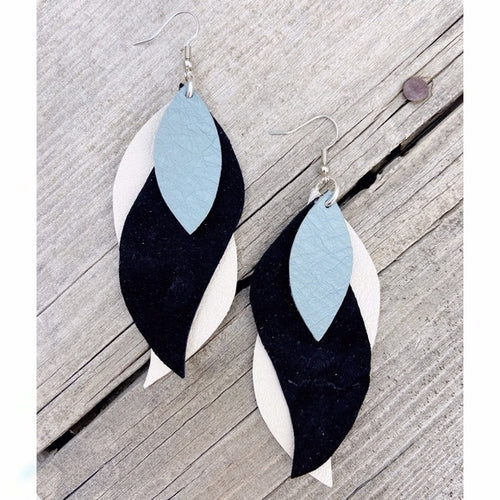 Coro Jewelry | 3 Layer Handmade Leather Earrings in Black, Ivory, and Pale Blue with Tags