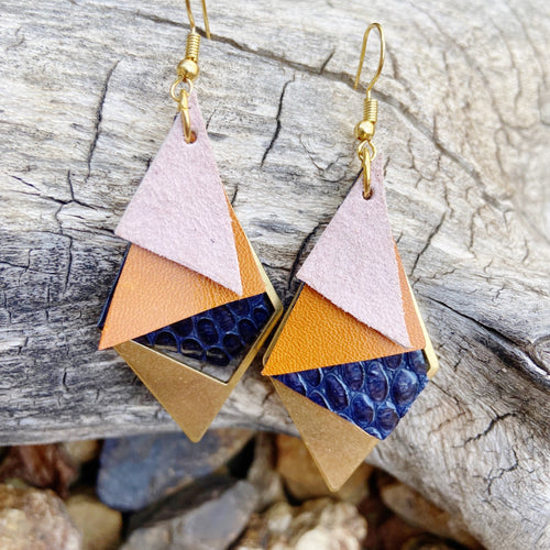 Coro Jewelry | Geometric Tri-Layer Embellished earrings - Navy, Rust and Pink with Tags
