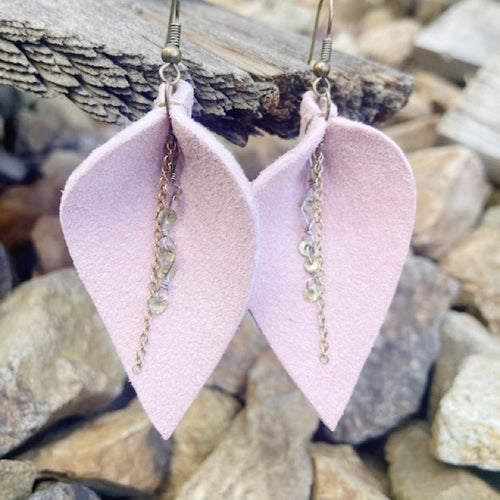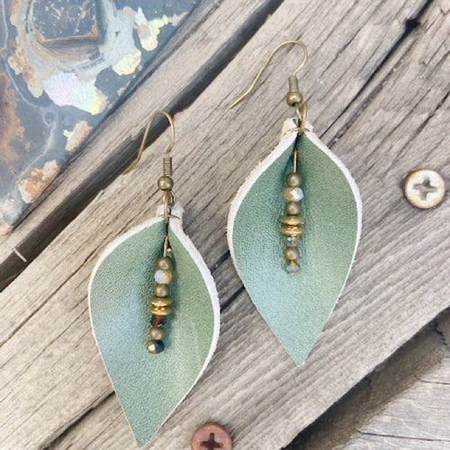 Coro Jewelry | Small Green "Leaf? Leather Earrings w/ Bead Embellishment with Tags