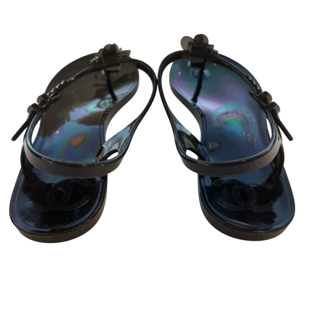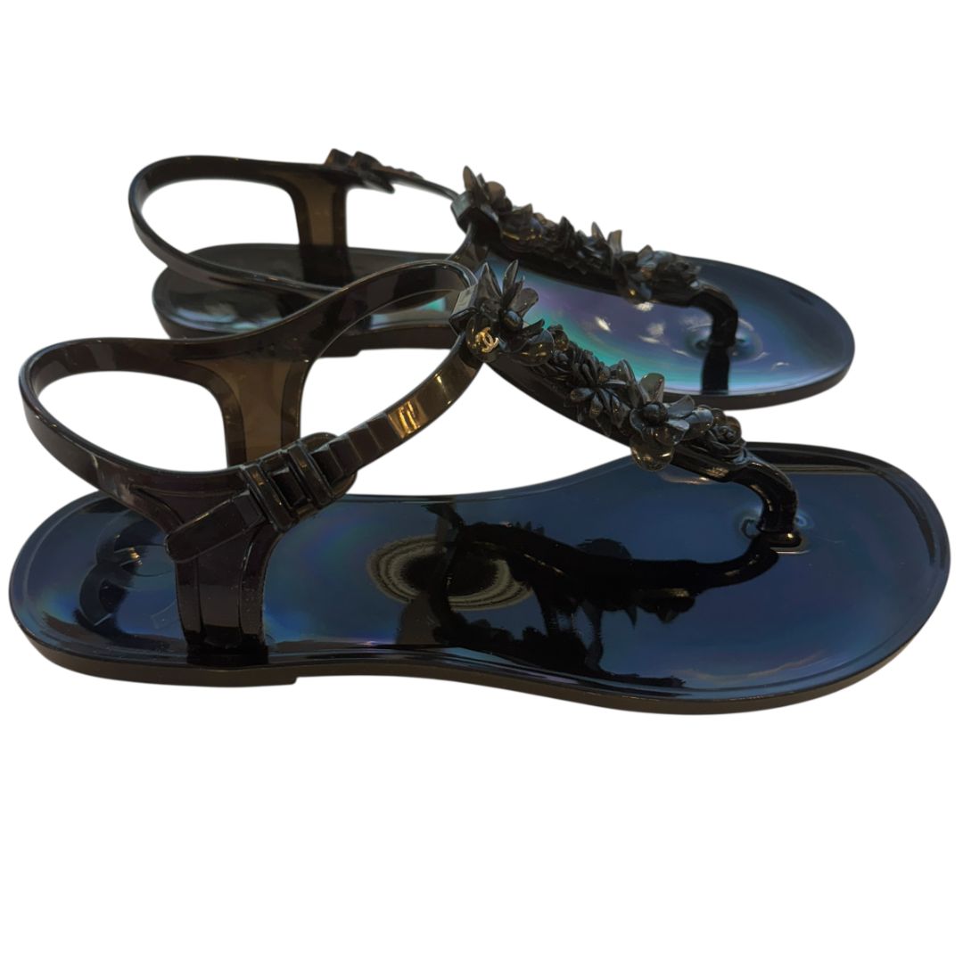 Step into warm-weather style with these Chanel women’s black floral jelly sandals in size 38. The sleek black jelly material is easy to wear and perfect for vacations, pool days, or elevating casual summer outfits. Floral detailing adds a feminine touch while keeping the look unmistakably Chanel. Slip them on with denim shorts, linen sets, or a simple sundress for an effortless designer finish.
