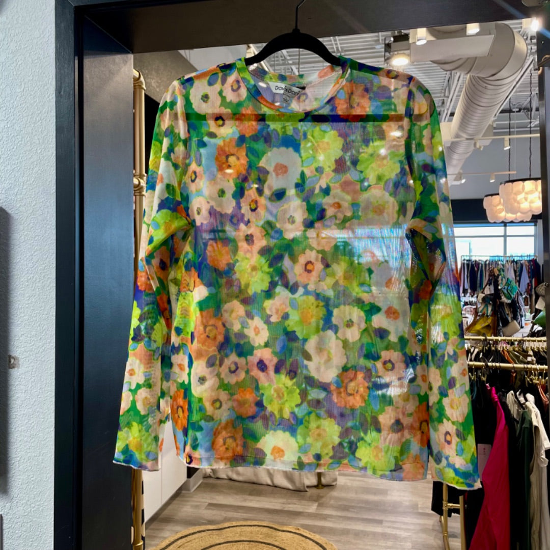 Davi & Dani | Women's Green Floral Print Mesh Long Sleeve Top | Size: L