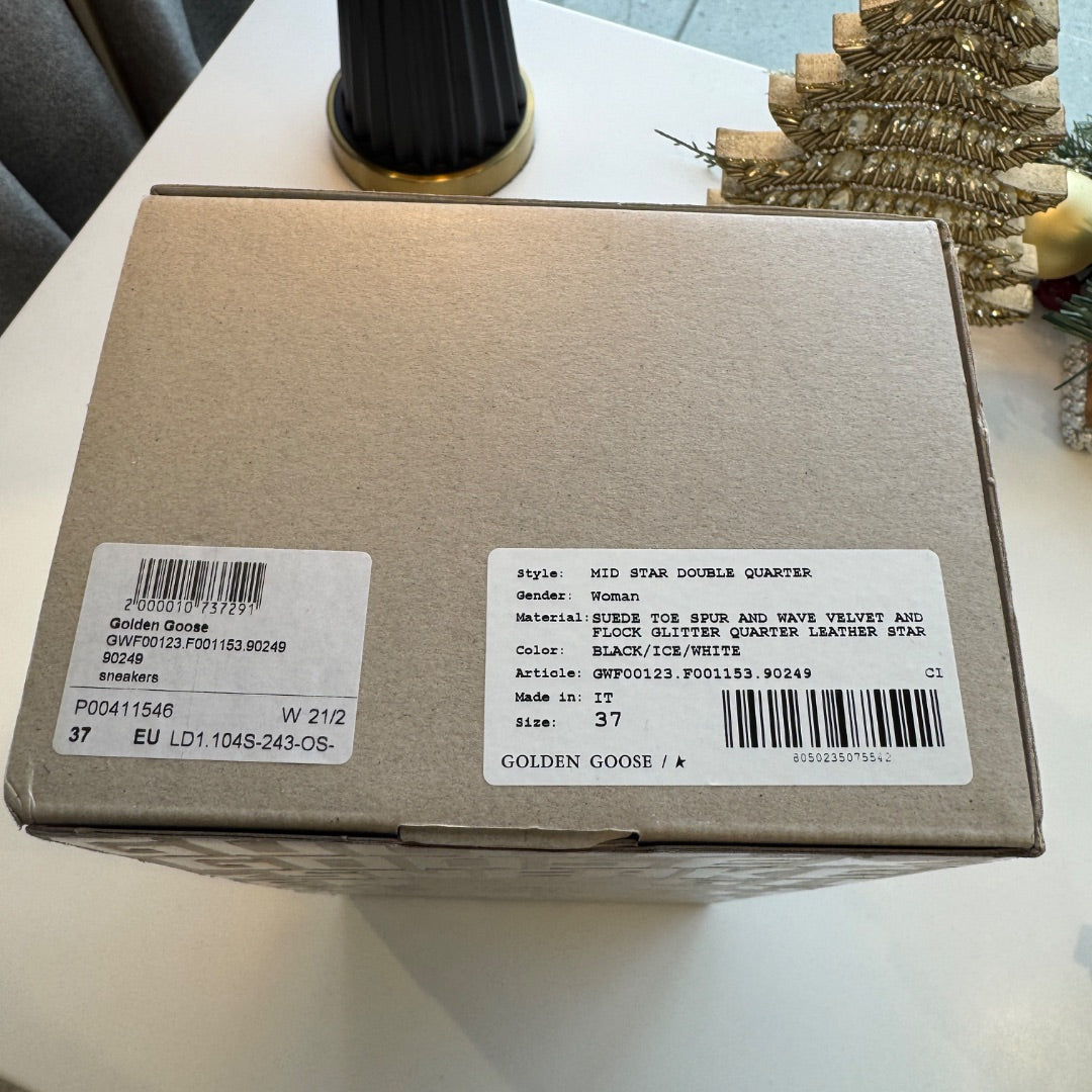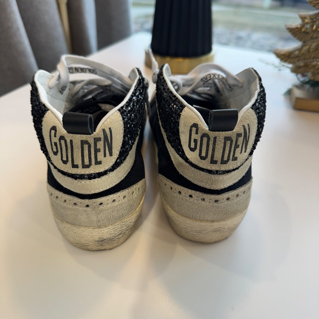 Make a statement with these Golden Goose Black Mid Star Velvet Glitter Sneakers in Size 37. Featuring a mix of soft velvet and glitter panels with the signature star design, these sneakers add the perfect touch of sparkle to any outfit.