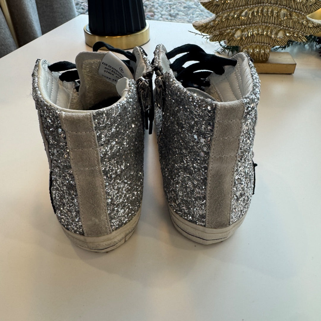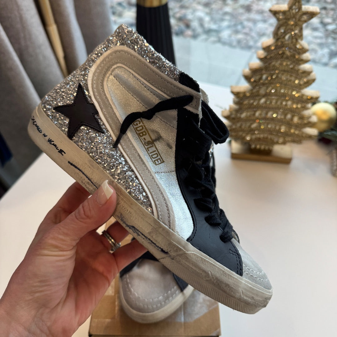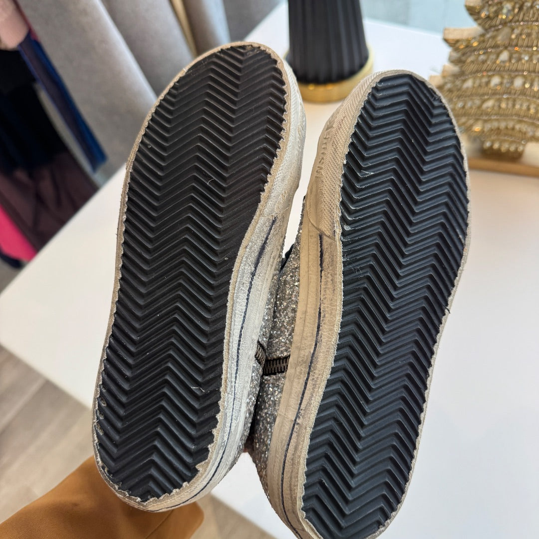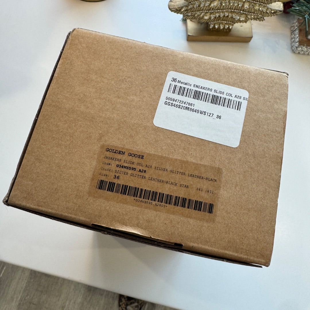 Shine wherever you go with these Golden Goose Silver Sequin Black Star Dreamed in Venice Slide Sneakers, Size 36. With sparkling sequin panels, a black star, and a signature distressed sole, these slides combine comfort and designer glamour.