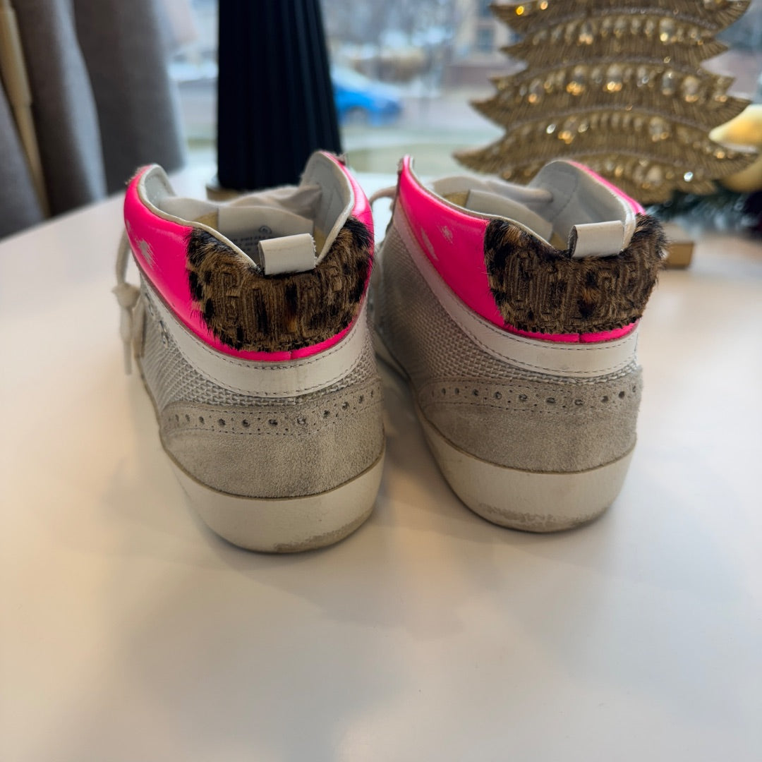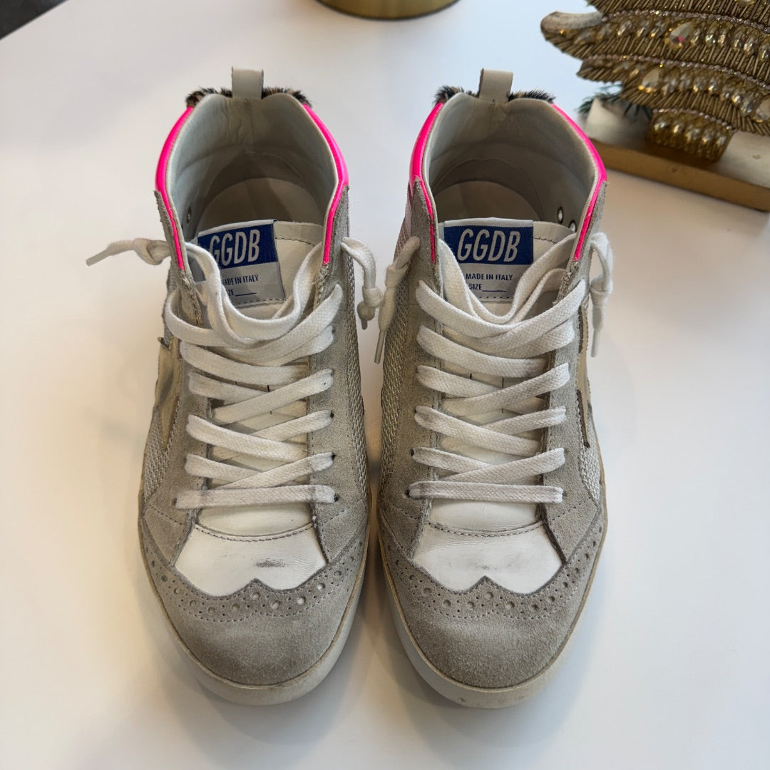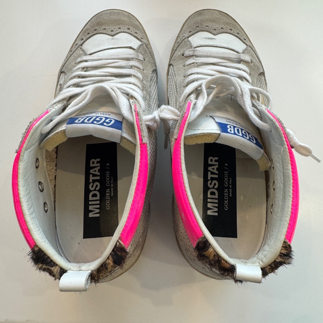 Show your style and your heart with these Golden Goose White & Gold Star Midstar Sneakers, Size 37. Featuring a crisp white base, gold star, and playful hot pink “All We Need Is Love” detail, these sneakers are perfect for adding a pop of color to any outfit.