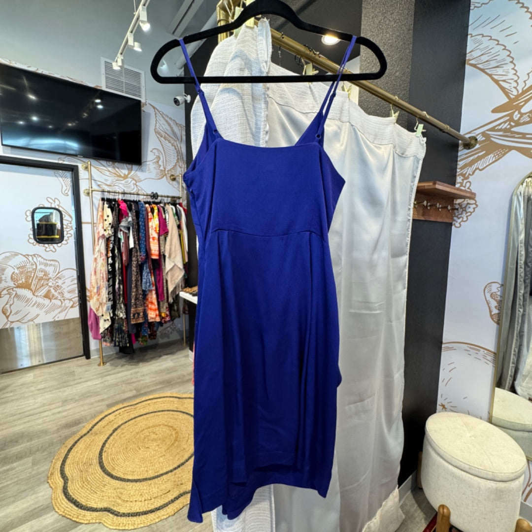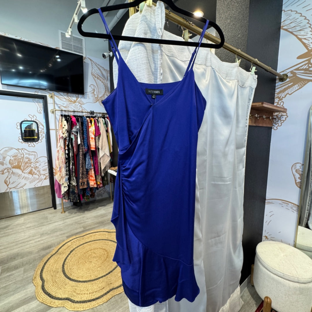 A shimmer blue thin strap flutter detail dress from Intermix. Side zip. Hidden button on chest.