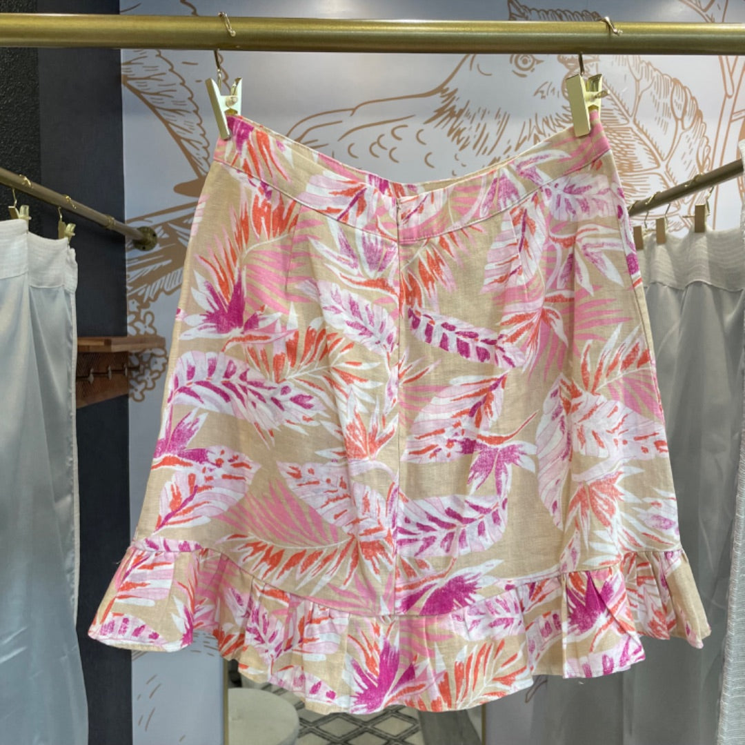 A fun pink and tan tropical print 100% linen faux wrap skirt from Karlie. Zip back.