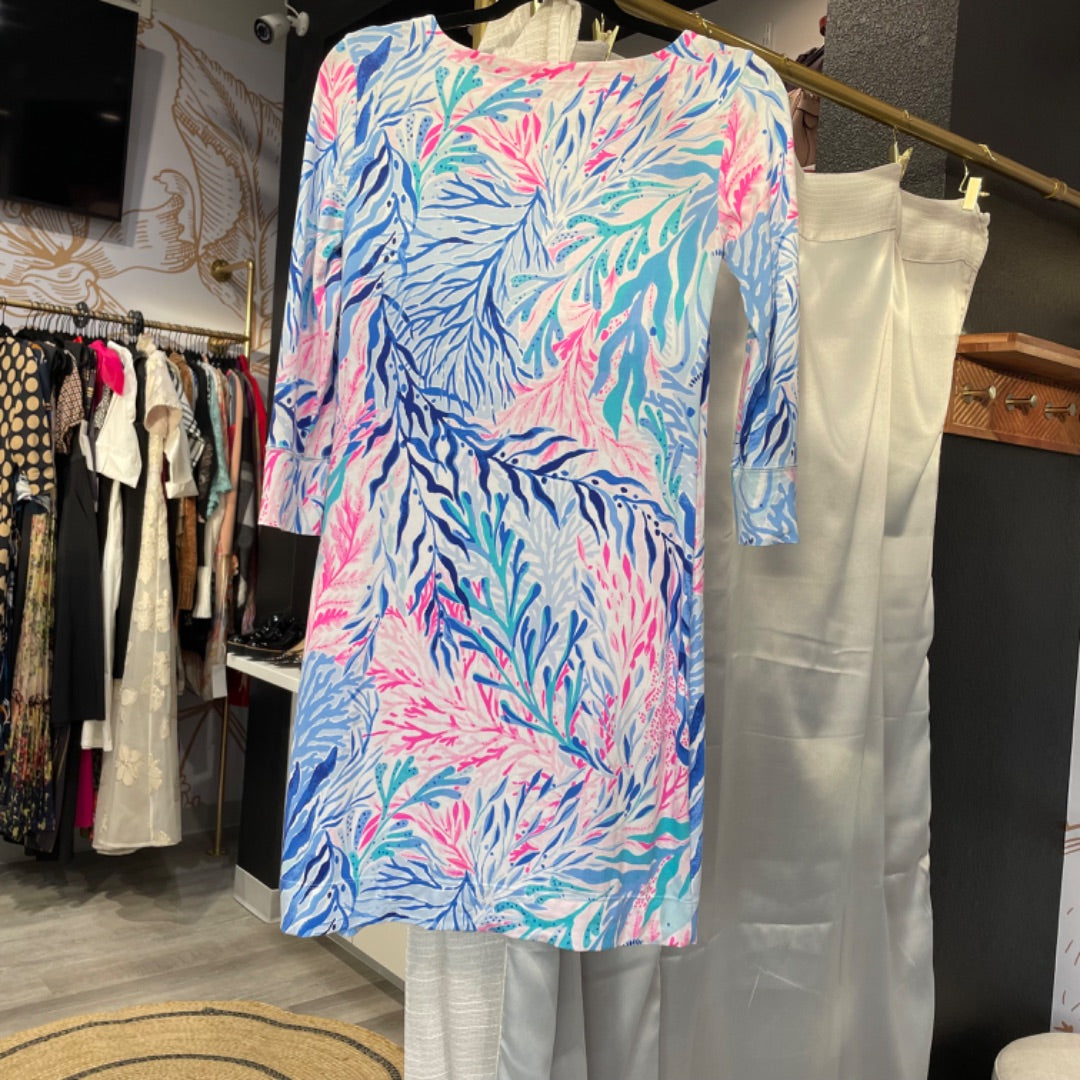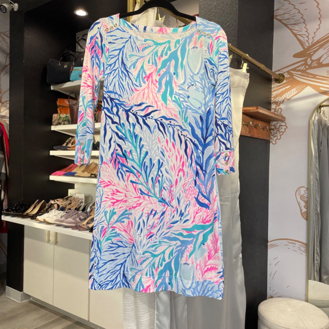 Bring beachy vibes to your everyday look with this Lilly Pulitzer Pink & Blue Underwater Print Button Shoulder Dress, Size XS. Featuring an ocean-inspired print and chic shoulder button details, it’s classic Lilly style through and through.