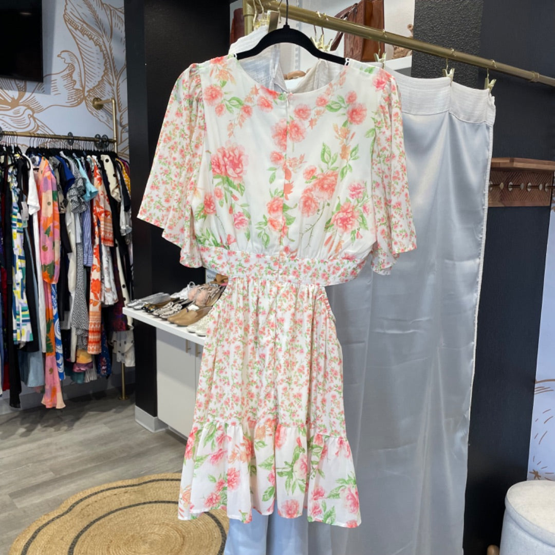 Love Colette | Women's Cream and Pink Floral Print Mini Dress | Size: L