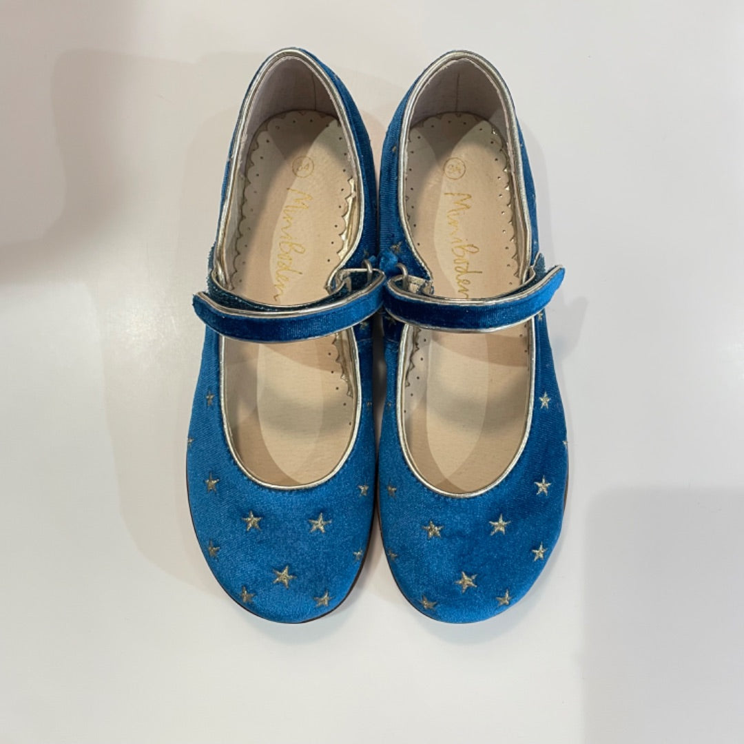 Mini Boden | Girl's Blue Velvet and Gold Star Mary Jane Shoes | Size: 34
