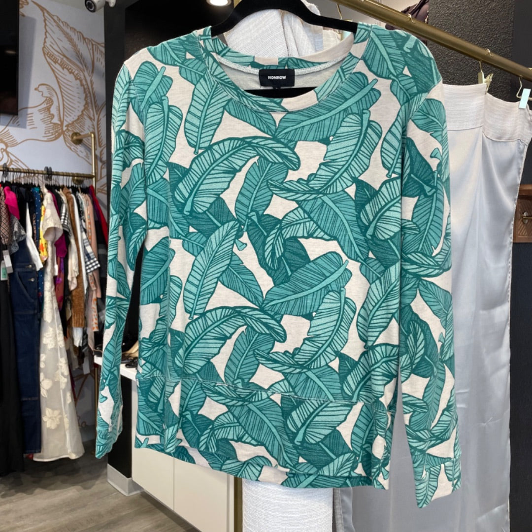 A beige and green banana leaf print crew sweatshirt from Monrow.
