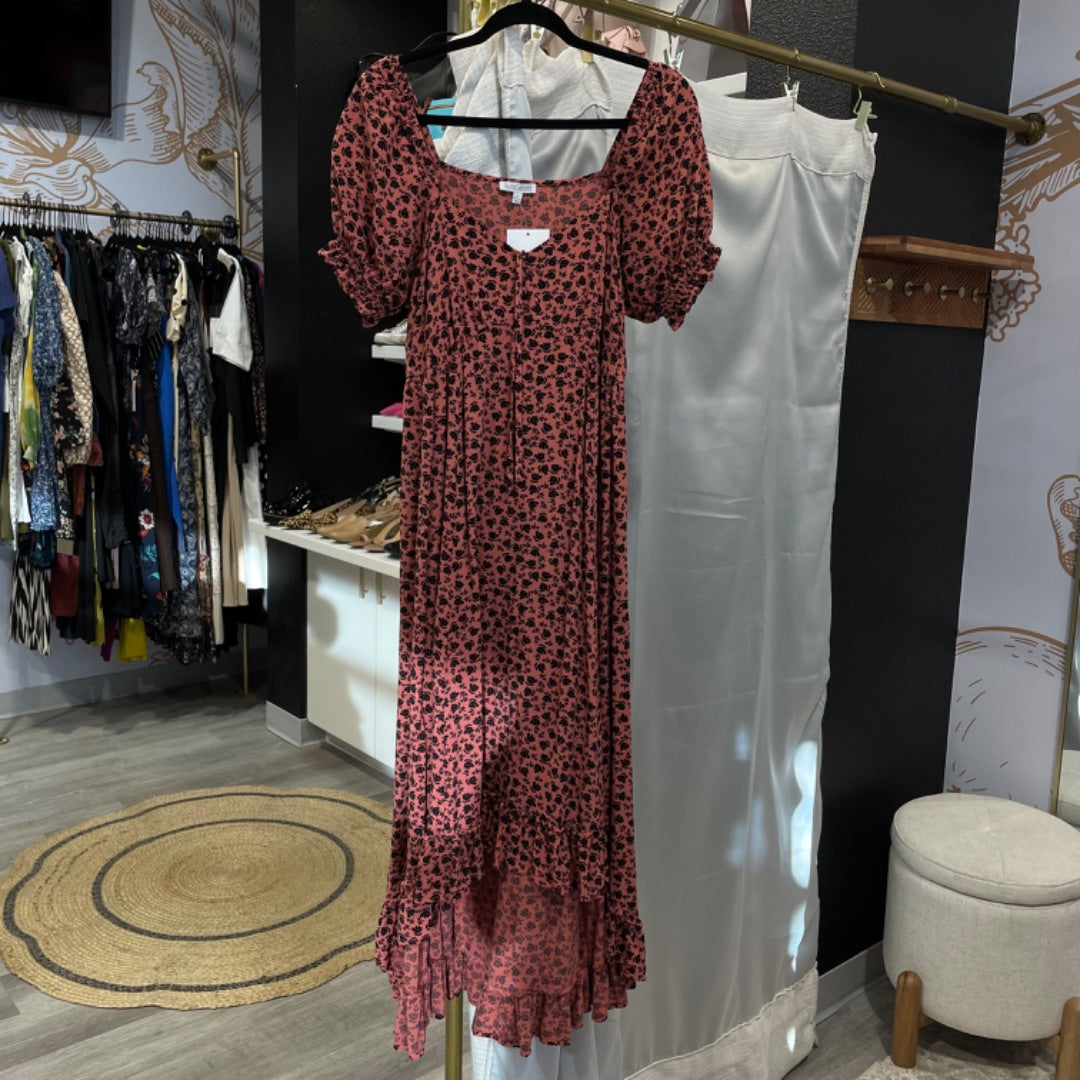 Patrons of Peace | Women's Pink and Black Floral Print Ruffle Maxi Dress | Size: L