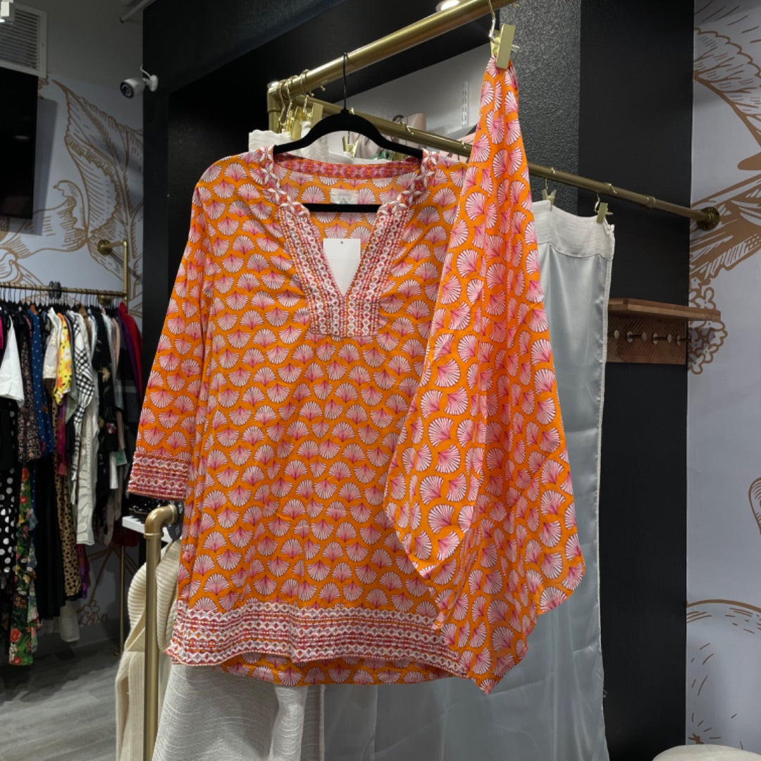 Sigrid Olsen | Women's Orange and Pink Sea Shell Tunic Top with Head Wrap | Size: L