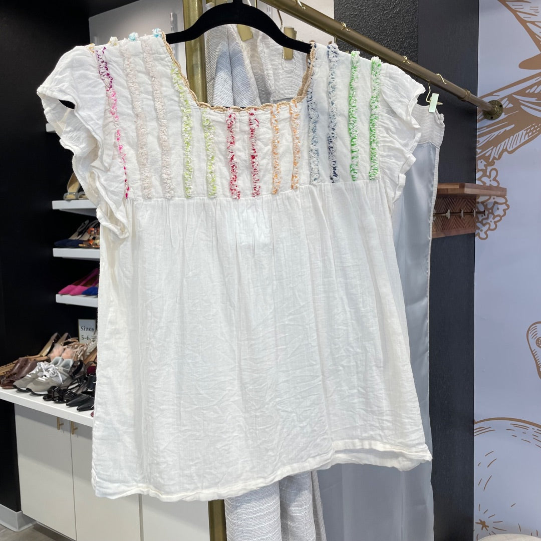 THML | Women's Cream and Colorful Fuzzy Short Sleeve Top | Size: S