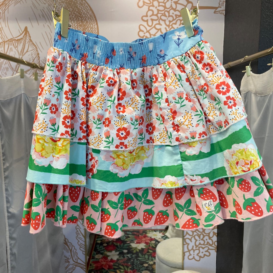 A fun, tiered, ruffled skirt from Wild Flowers in multiple patterns and colors with flowers and strawberries prints. Elastic waist. Button detail at waist.